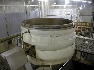 「甑」この中に麻布で包んだ米を入れ、て蒸します。下半分は水を入れて、それをボイラーからの高温の蒸気で沸騰させ、蒸気を発生します。わざわざ、釜の中の水を沸騰させるのは、最初は湿度が高く温度の低い蒸気が徐々に高温で乾燥した蒸気に変化していくのが蒸米のためには良いからです。