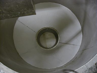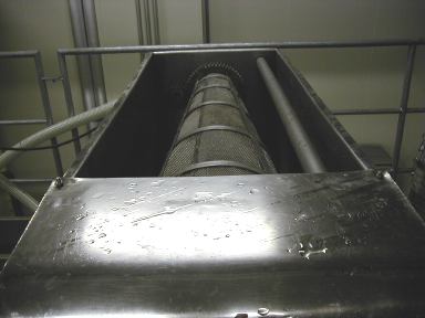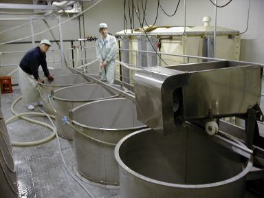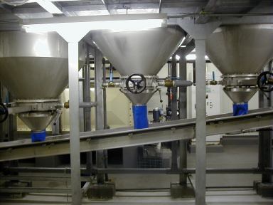 洗米された米は洗米機の下の漏斗状のタンクに落下します。ここで水を切られ洗米は完了します。