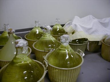 また、通常は大きな貯蔵タンクで貯蔵しますが、高級酒は写真のような「斗びん」と呼ばれる18リットル入りの瓶で貯蔵されます。もちろん冷蔵貯蔵です。